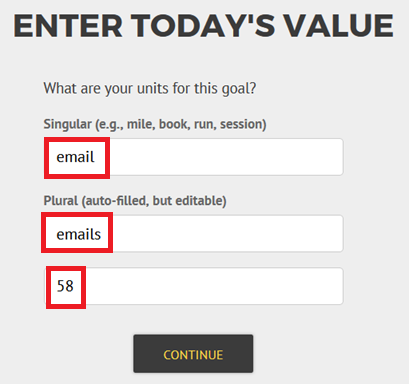 - Enter the units you want to use and today's value, to set your starting point. In this example, I'm tracking emails and I have 58 emails right now.